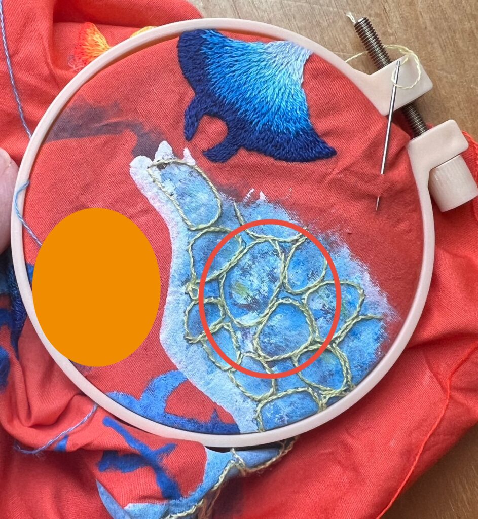 生地のオレンジに合わせて黄色がかった糸を入れつつ。