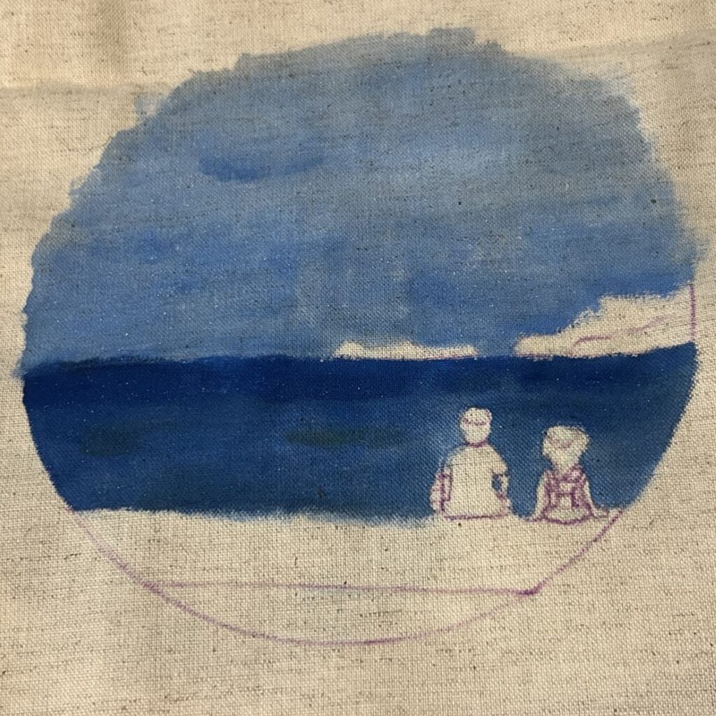 海と空を布用絵具で表現することにより、