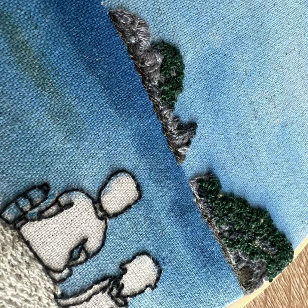 遠くに見える岩は立体感を出すため、糸の上に糸を重ねました。