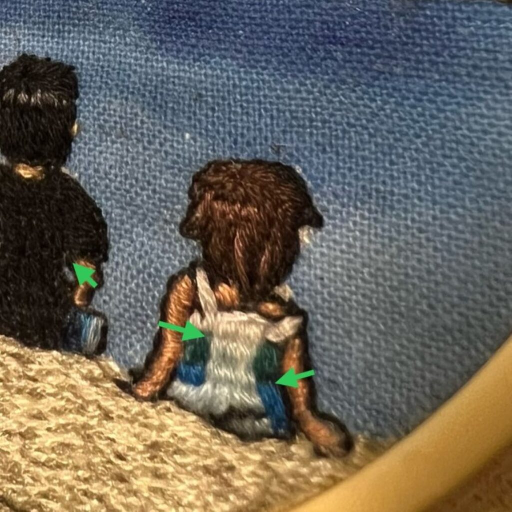布地部分(刺繍糸と絵具の境目)が